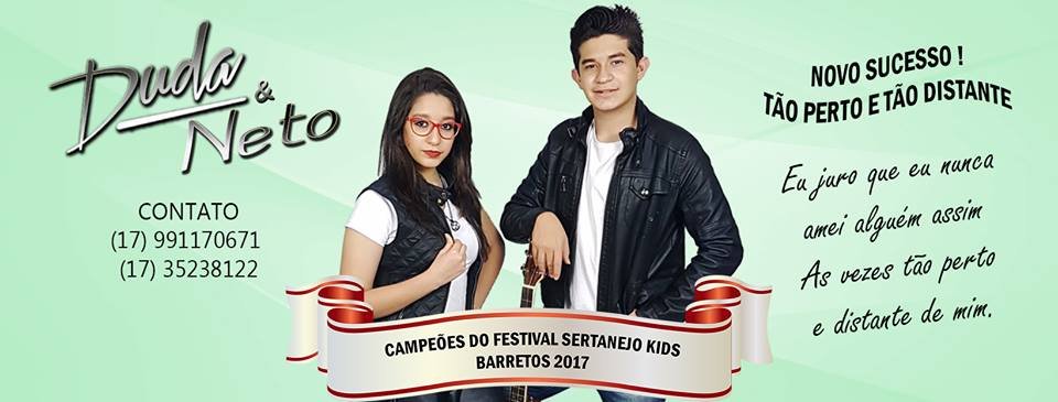 Duda & Neto, Irmãos de 14 e 16 anos, que moram na cidade de Catanduva!! Cantam profissionalmente á 3 anos fazendo tanto eventos particulares quanto beneficentes. Cantaram no Palco Culturando no Rodeio de Barretos 16/17, No palco Festeja também em Barretos 17 e ainda em Barretos foram campeões do 2º Festival Barretos Kids (âmbito Nacional).. Já Fizeram aberturas para renomados cantores e bandas como: Guilherme e Santiago e Trio Los Angeles.